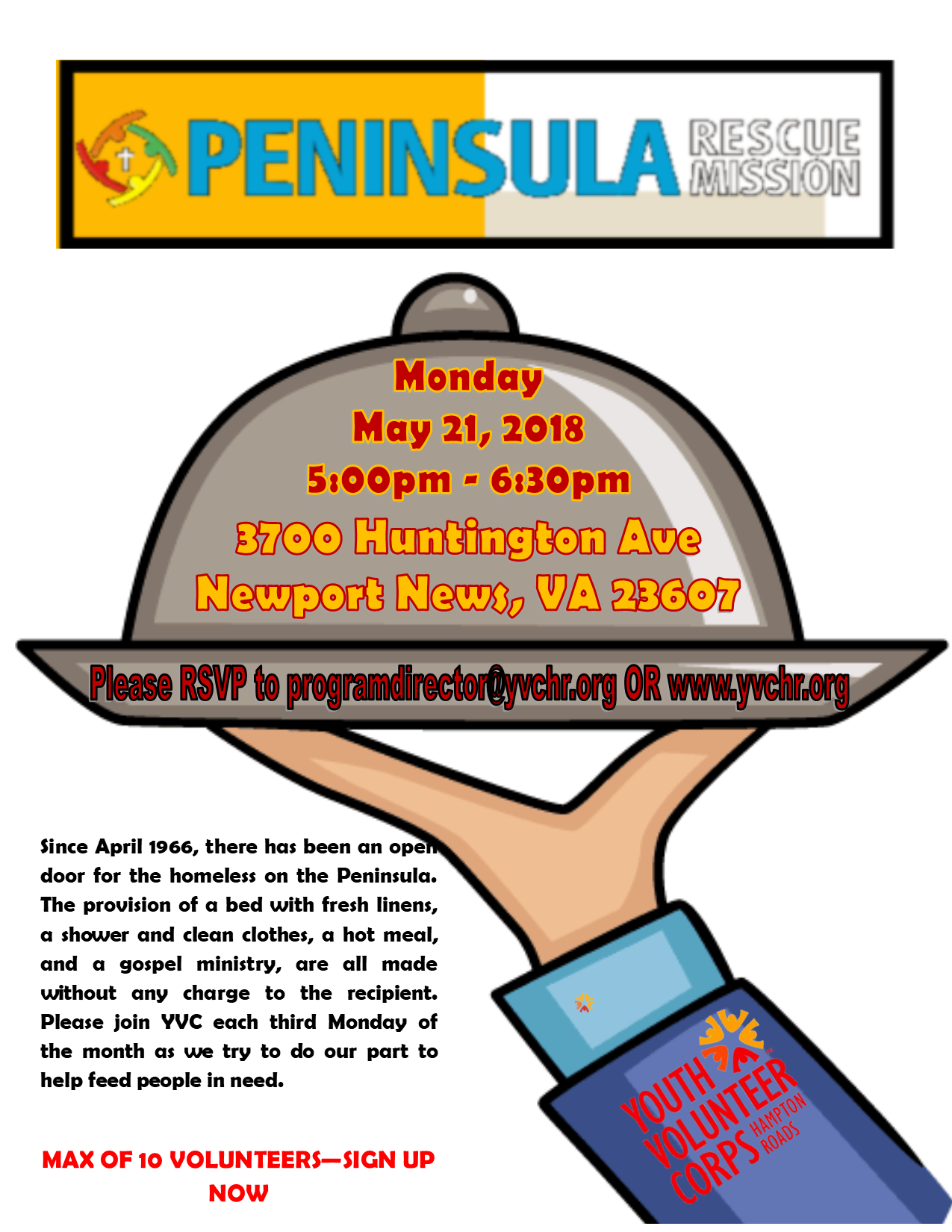 Peninsula Rescue Mission Monday, May 21, 2018 5:00 PM 6:30 PM 3700 Huntington Avenue Newport News, VA, 23607 United States (map) Google Calendar ICS
