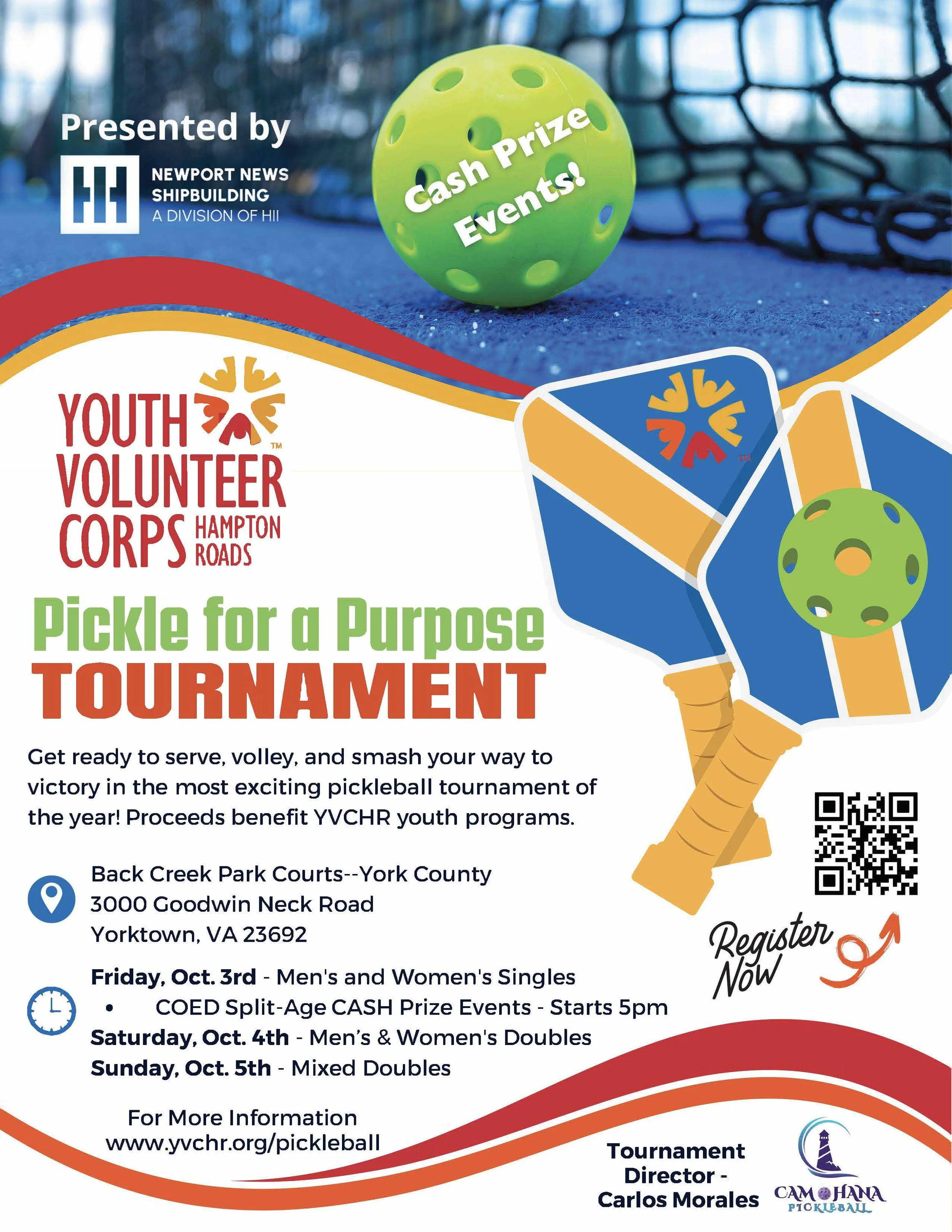 Tournament will be held at Back Creek Park Pickleball Courts at 3000 Goodwin Neck Rd, Yorktown, VA 23692.